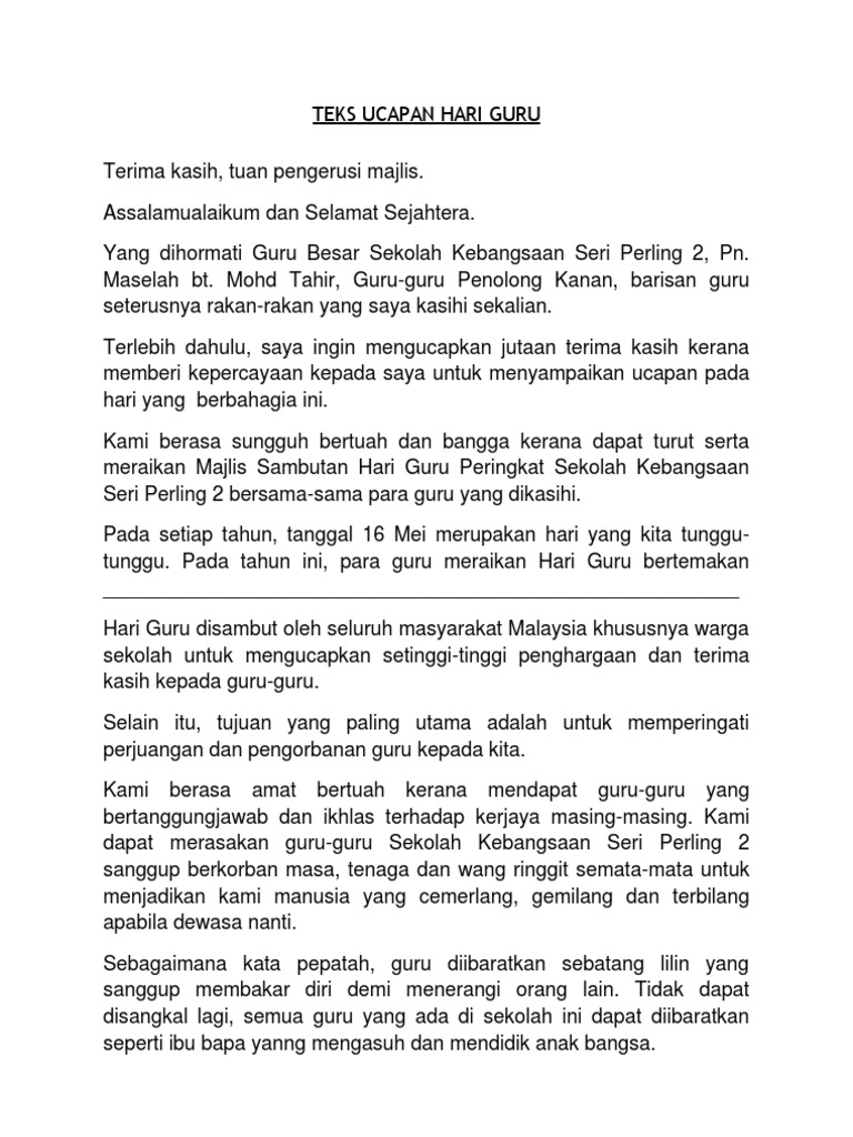 Teks ucapan guru besar sempena hari guru 2021. Berikut kami kongsikan contoh-contoh ucapan untuk Guru tidak kira apa sahaja acara termasuklah Hari Guru perpisahan guru dan lain-lain lagu sebagai panduan bersama. Saya pasti whatsapp twitter atau instagram cikgu dihujani dengan mesej ucapan Selamat Hari Guru. Berikut adalah teks ucapan penuh Timbalan Perdana Menteri yang juga Menteri Pelajaran Tan Sri Muhyiddin Yassin sempena sambutan Hari Guru 2011 yang berlangsung di Borneo Convention Centre di sini pada petang Isnin.